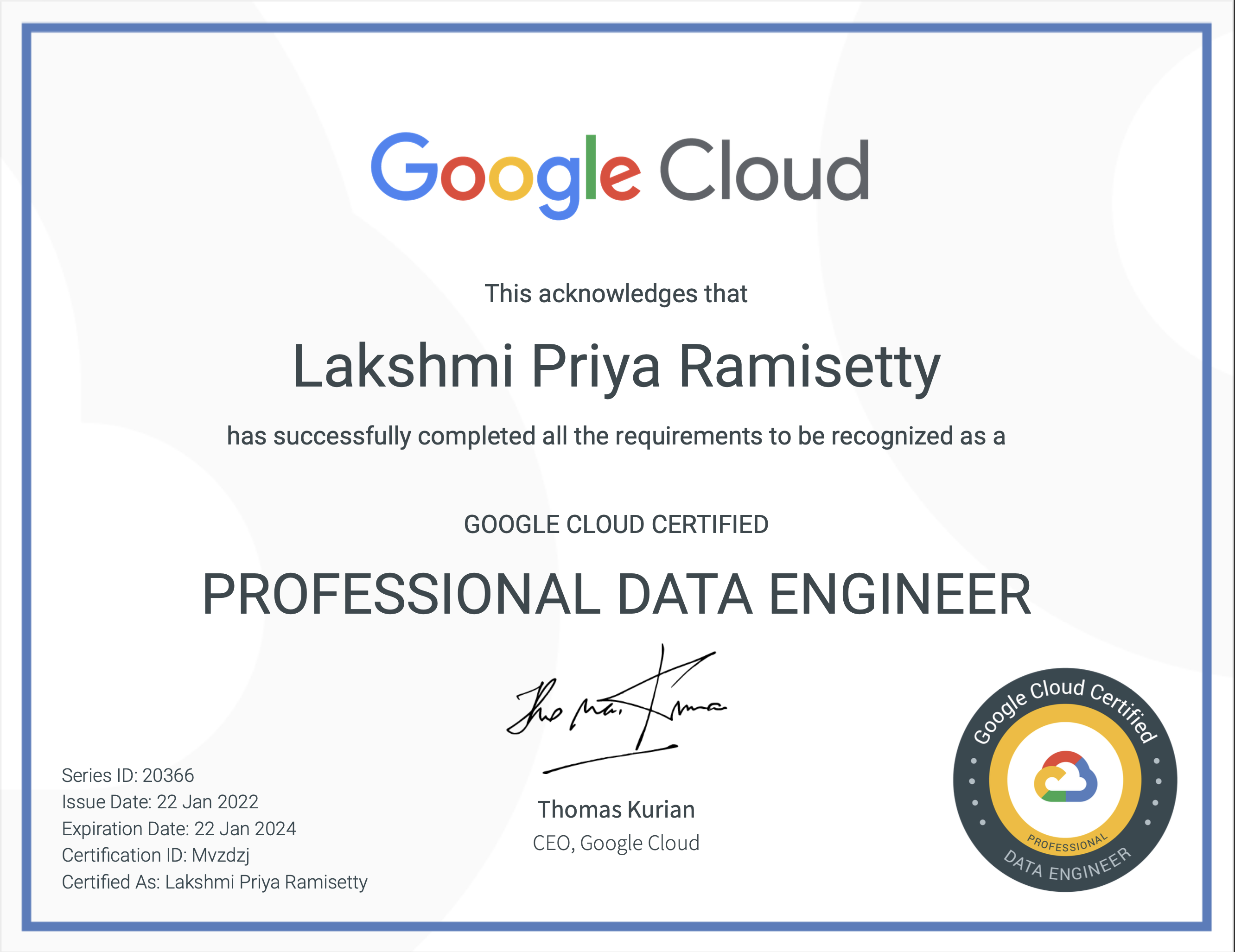 👋 Hello! I'm Lakshmi Priya Ramisetty, an experienced and certified Data and Machine Learning Engineer with a robust background in both data engineering and machine learning, and a specialized focus in Generative AI. I hold a Bachelor’s degree in Computer Science and a Master’s in Artificial Intelligence, which together provide a solid academic foundation that I leverage to tackle complex, real-world challenges in AI and data-driven solutions.